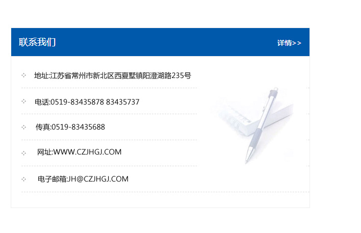 地址:常州市新北區友邦商務大廈1幢16、17層  電話:0519-85101652  傳真:0519-85112595  郵編:213022  網址:www_cz-jiayue_cn.yzsuoao.com  郵箱:xiajifengaa@163.com